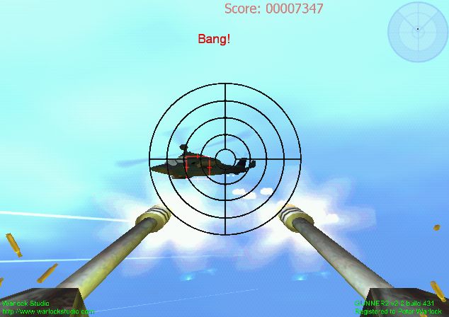 GAME DESCRIPTION : If you're looking for original 3D-shooter software, Gunner 2 will provide adrenaline-pumping action. The game has three episodes: World War II-style Episode I, with old-fashioned crafts and weapons; Episode II with modern crafts and weapons; and futuristic Episode III with UFOs and plasma weapons. Now for the surprise: All your targets are up in the air! Gunner 2 comes equipped with 9 types of weapons, 19 enemy crafts, great graphics and addictive gameplay.